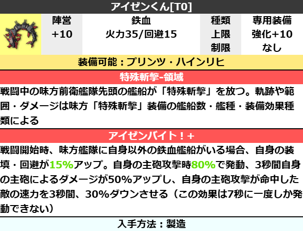 | 味方艦隊にほかの鉄血艦船がいる場合、自身の装填・回避が15%アップ。自身の主砲攻撃時50%で発動、3秒間自身の主砲によるダメージが25%アップ(この効果は7秒に一度しか発動できない) |