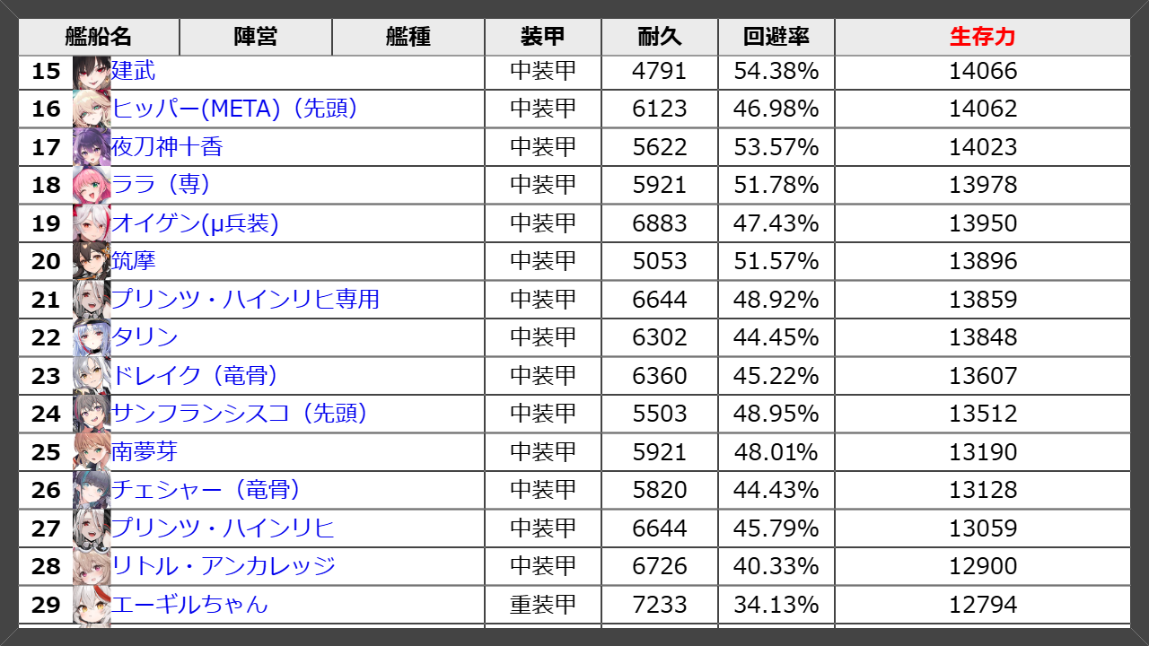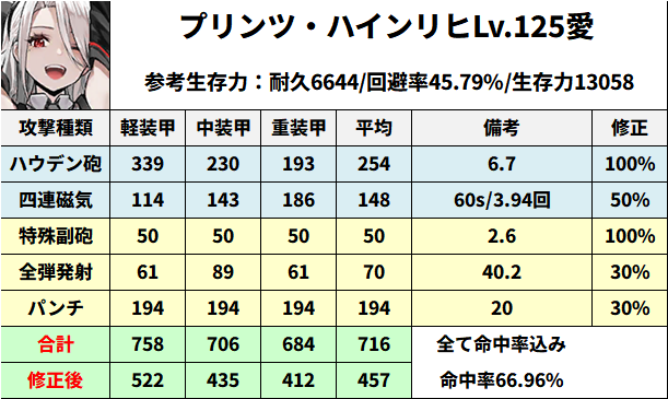参考程度に上記ステータスからプリンツ・ハインリヒの回避率/命中率/CRT率(クリティカル)/総耐久(回避率を考慮した実質耐久)を測定