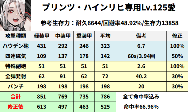プリンツ・ハインリヒの最大強化レベル125愛のステータスを掲載、改造が実装されている艦船は改造後の能力を表示