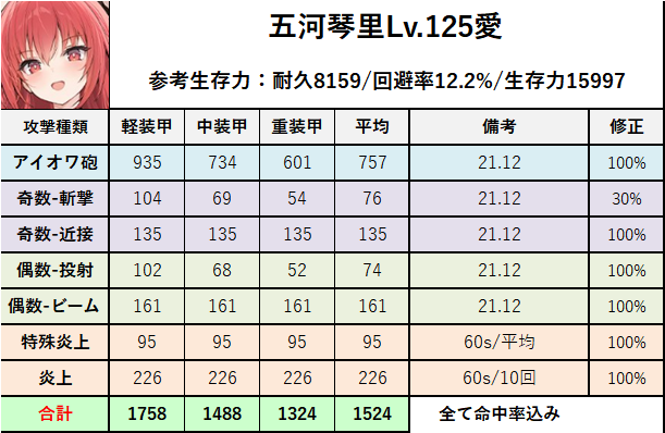 五河琴里の最大強化レベル125愛のステータスを掲載、改造が実装されている艦船は改造後の能力を表示