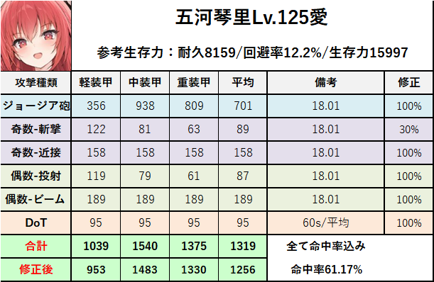 参考程度に上記ステータスから五河琴里の回避率/命中率/CRT率(クリティカル)/総耐久(回避率を考慮した実質耐久)を測定