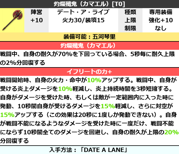 | 自身の主砲攻撃時、天使【灼爛殲鬼】が下記の攻撃モードに応じた効果を発動する。攻撃モードは主砲攻撃を行うたびに切り替わる: ①灼爛殲鬼(カマエル)特殊弾幕Lv.10を展開し、特殊弾幕発動後に灼爛殲鬼による特殊攻撃Lv.10を追加で行う(特殊弾幕・特殊攻撃の威力はスキルレベルによる)。戦闘開始時、灼爛殲鬼(カマエル)モードから始まる ②灼爛殲鬼砲(メギド):強力弾幕Lv.10を展開する(威力はスキルレベルによる) 天使【灼爛殲鬼】の特殊攻撃および強力弾幕が命中した敵に対して、10秒間持続する特殊炎上効果を付与し、1秒ごとにダメージを与える(威力は五河琴里の火力ステータスによる) |
