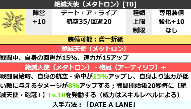 戦闘開始時、自身の航空・命中が15%アップし、自身より速力が低い敵に与えるダメージが8%アップする;戦闘開始後20秒毎に【絶滅天使・砲冠+】Lv.10を発動する(威力はスキルレベルによる)