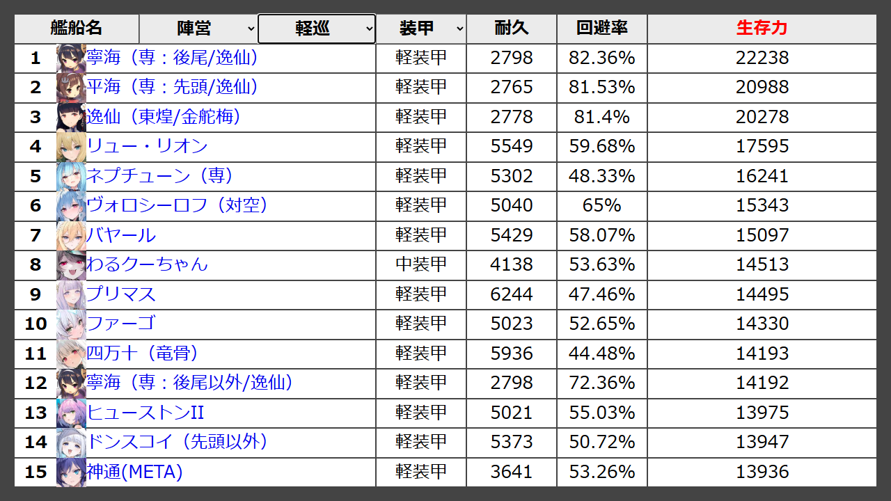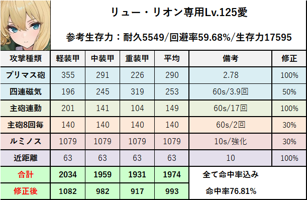 軽減効果が不具合で無ければ、リュー・リオンの生存力は17500以上が見込める。これは軽巡単体で最強クラスの数値です。