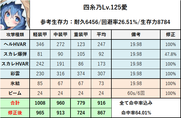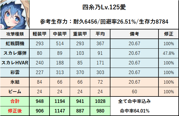 参考程度に上記ステータスから四糸乃の回避率/命中率/CRT率(クリティカル)/総耐久(回避率を考慮した実質耐久)を測定