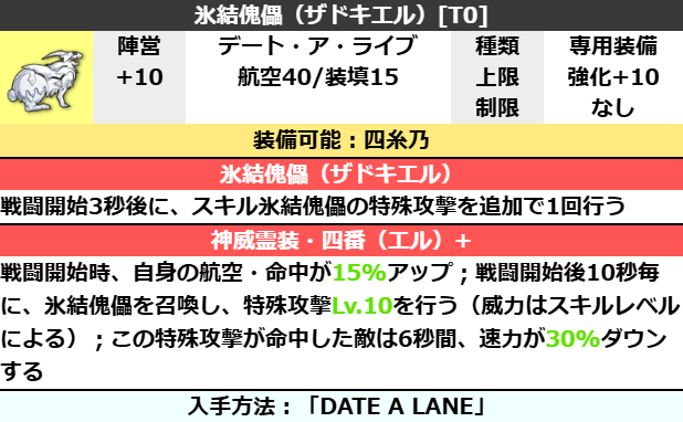 戦闘開始時、自身の航空・命中が15%アップ;戦闘開始後10秒毎に、氷結傀儡を召喚し、特殊攻撃Lv.10を行う(威力はスキルレベルによる);この特殊攻撃が命中した敵は6秒間、速力が30%ダウンする