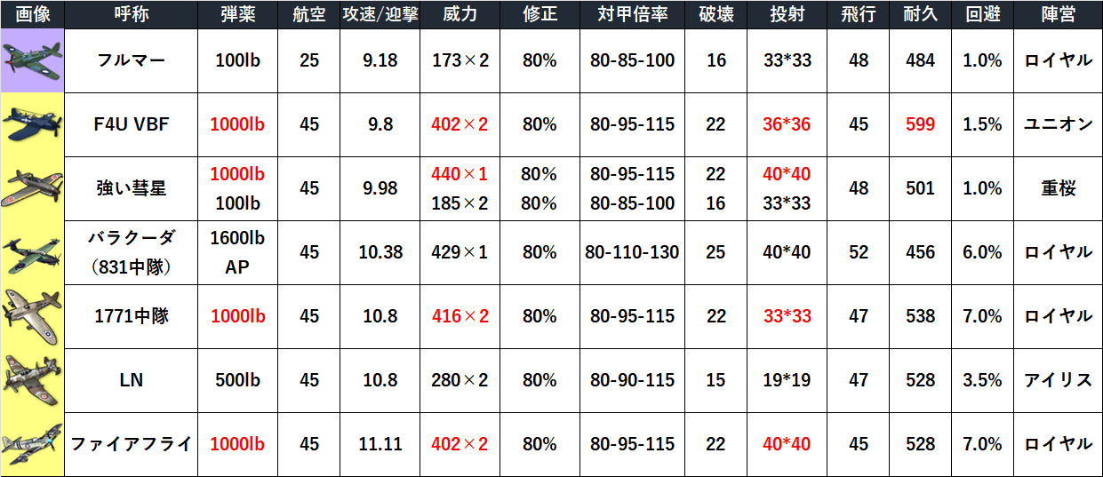 爆撃機最速はフルマー。攻撃性能は無いに等しいが、機銃性能や攻速に優れることから稀に使われることがある。