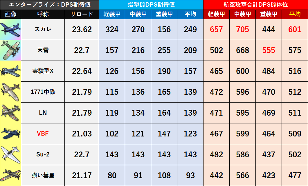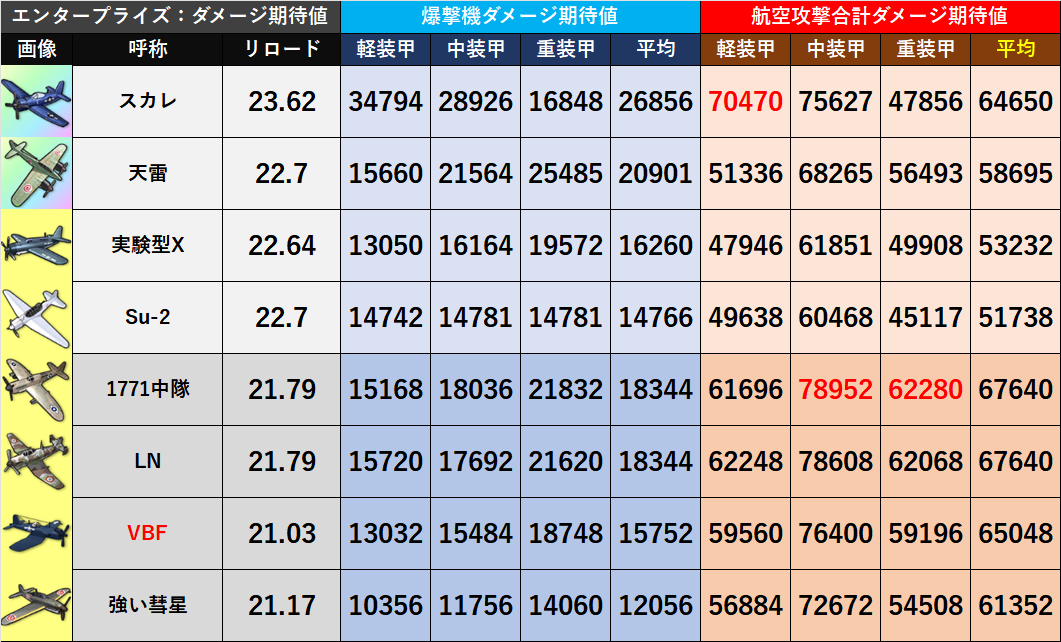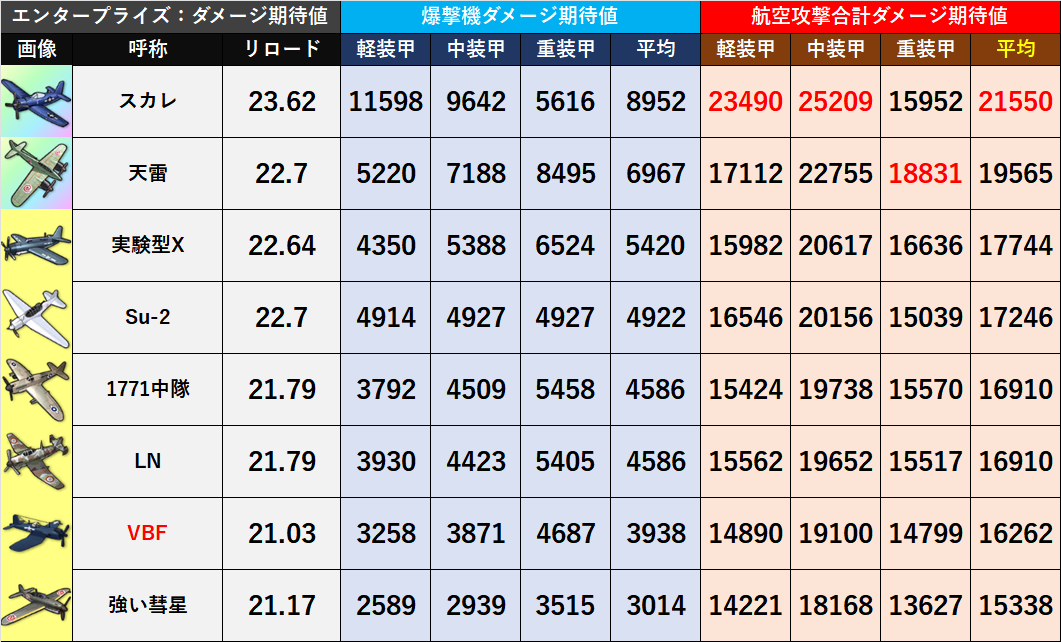 この条件では軽装甲に対してスカイレーダーが強く、中装甲と重装甲はVBFでも勝てる見込みがあります。