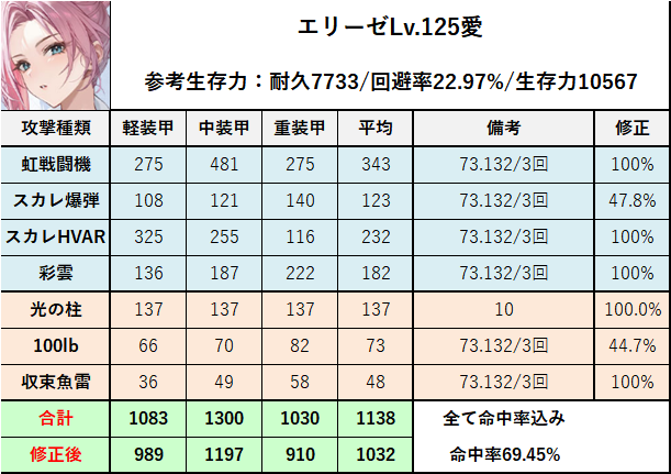 エリーゼの最大強化レベル125愛のステータスを掲載、改造が実装されている艦船は改造後の能力を表示