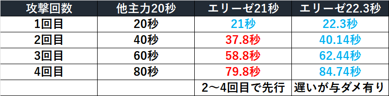 仮にエリーゼのリロードをほかの主力より1秒遅く調整している場合、短縮効果の影響で2回目~4回目までエリーゼが先行してしまう。