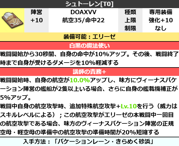 自身の初回航空攻撃時、ヴィーナスバケーション陣営の空母・軽母は航空リロードを20%短縮する。