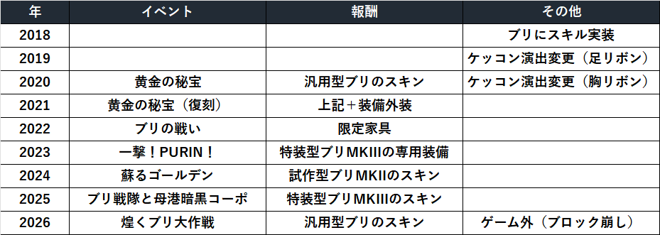2023年は「一撃!PURIN!」が開催され、特装型ブリの専用装備を入手できました。