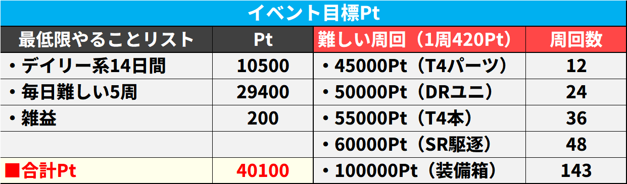 今回はイベントPtを集めても交換に使えないので、累計Pt報酬からイベント目標を決めよう。