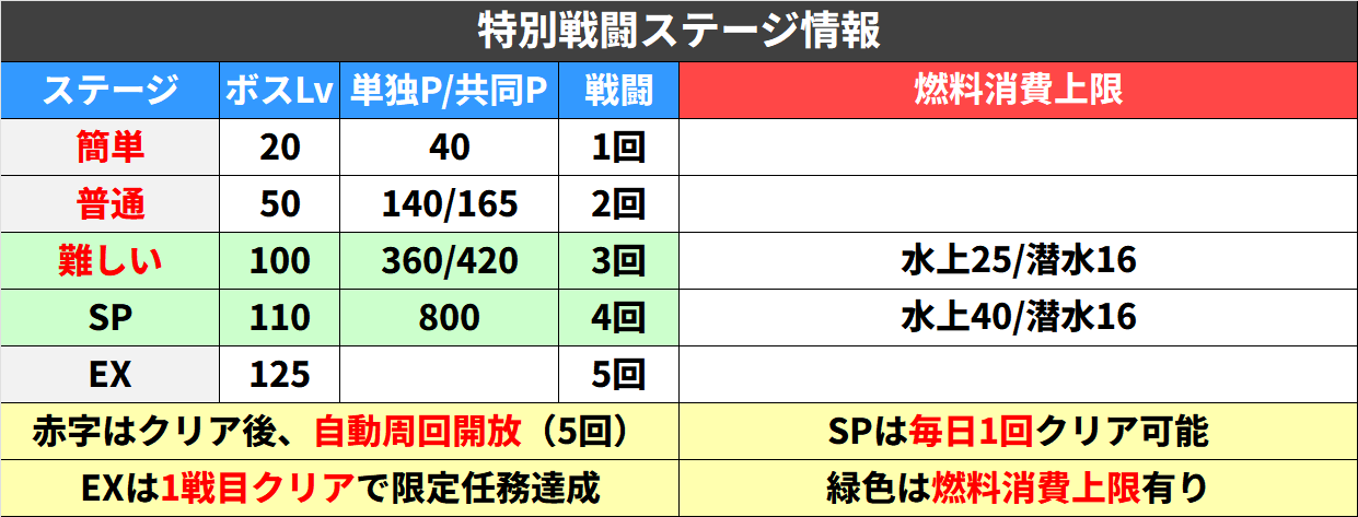 ちなみにSPのPt効率は燃料消費上限で回すと難しいより低くなる。SPはなるべく低燃費編成で挑戦しよう。いつもの回復空母+ミサイル駆逐艦で攻略可能。
