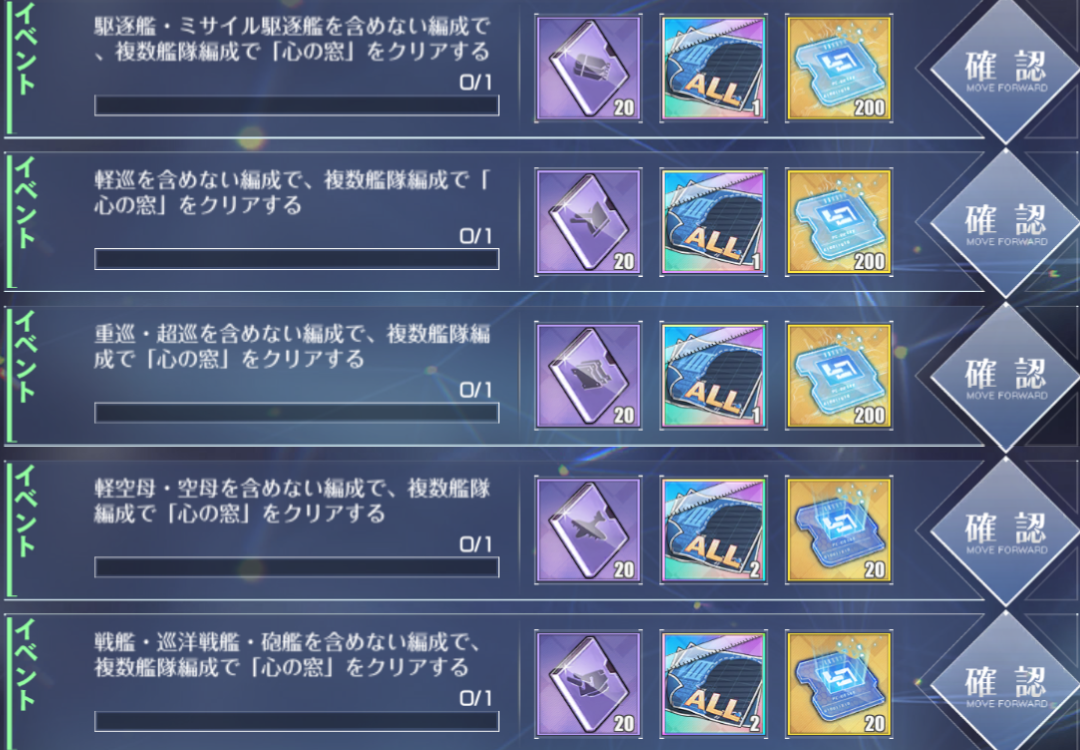 指定されていない艦種には、航空戦艦・風帆・工作艦・運送艦が挙げられる。これらで編成してクリアすれば一度に全ての限定任務を達成可能。