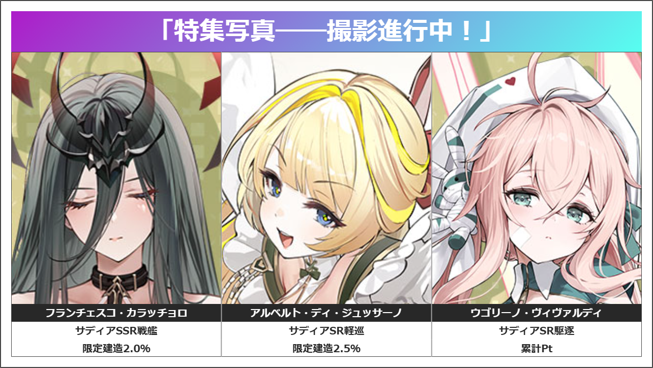 次のメンテではインプラカブルも常設入りするそうなので、建造Ptを集めておくのも良いでしょう。