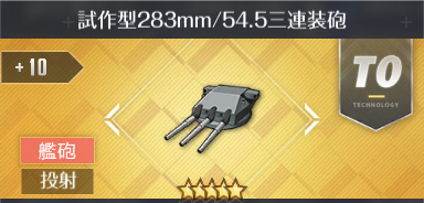 大口径主砲「試作型283mm/54.5三連装砲[T0]」のステータス(強化+10)。