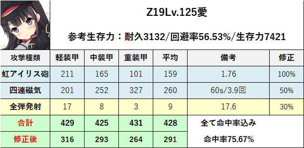 参考程度に上記ステータスからZ19の回避率/命中率/CRT率(クリティカル)/総耐久(回避率を考慮した実質耐久)を測定
