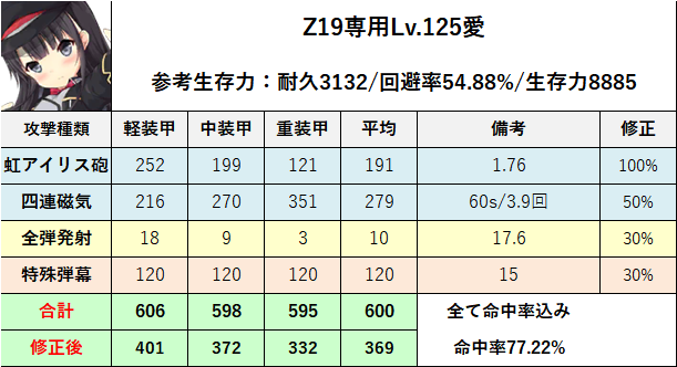 Z19の最大強化レベル125愛のステータスを掲載、改造が実装されている艦船は改造後の能力を表示
