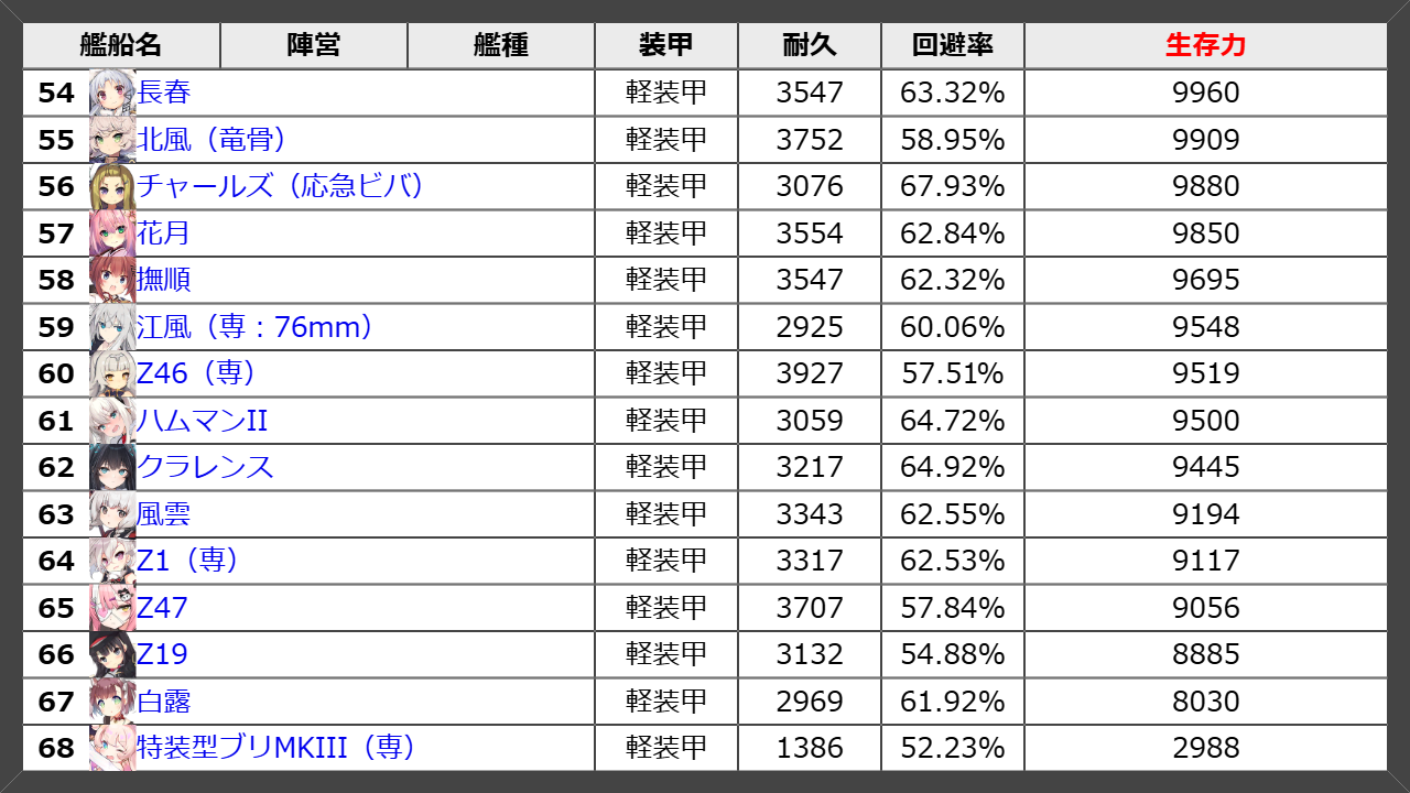 この2隻と比べた場合、耐久はZ19が勝るものの、回避と幸運の差が大きい。
