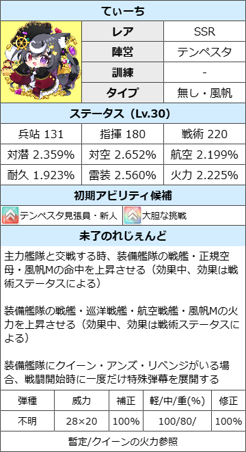 SSR「てぃーち」は風帆Mや空母を強化できる。相方候補には「えいぶりー」や「どれいく」が挙げられる。