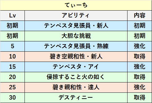 レベルを上げていくと火アビとデスティニーを習得する。この点はSSR限定オフニャの「どれいく」「きっど」「えいぶりー」と同じ。