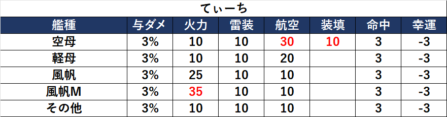 「てぃーち」のアビリティ構成は空母と風帆Mの強化値が高く、次点は他の風帆と軽母となっています。