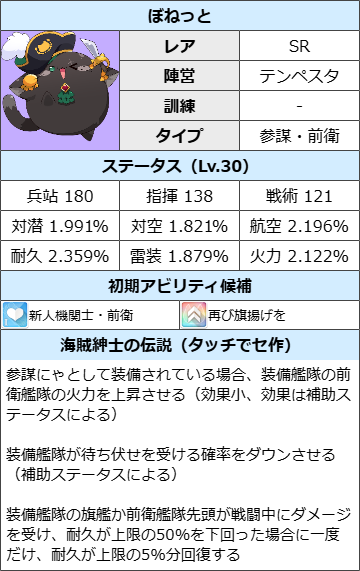 厳選もリセットも不要で、このレベルのオフニャを確実に入手できる。新規指揮官は忘れずに入手しておきましょう。