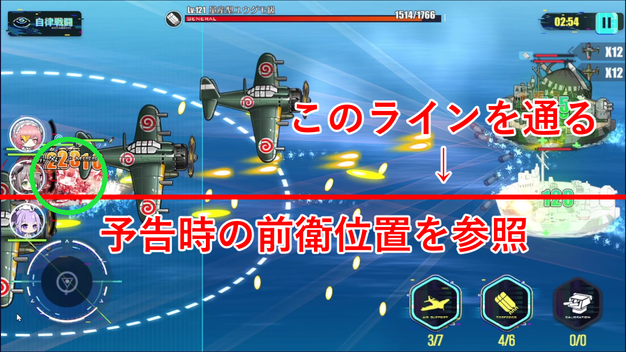 このとき編隊が通るラインは空襲予告時に前衛がいた位置を参照しています。