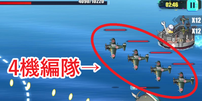 ただし、12と表示されていても12機が一斉に飛んでくるとは限らない。ステージや艦隊の種類によって様々だが、画像の例では4機が3秒間隔で3回飛んできます。