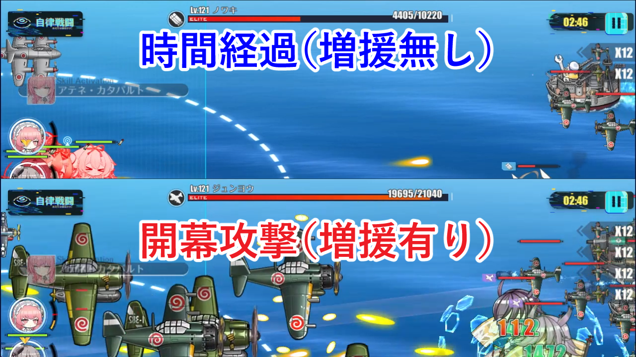仮に3機到達した場合、以降の空襲は補充+3機という具合になる。これは撃墜しない限り、戦闘終了まで繰り返されます。