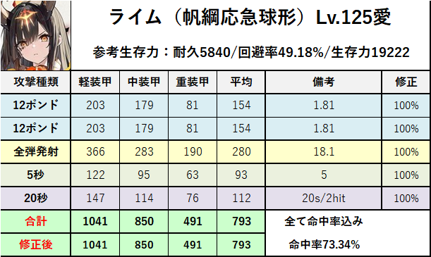 ライムの最大強化レベル125愛のステータスを掲載、改造が実装されている艦船は改造後の能力を表示