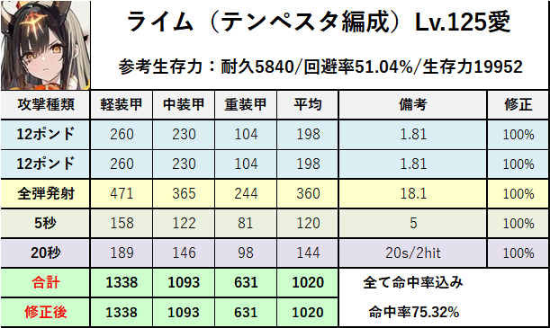 また、同じ風帆Vのゴールデン・ハインドが中装甲500程度なので、ライムの中装甲DPSはかなり高いほう。