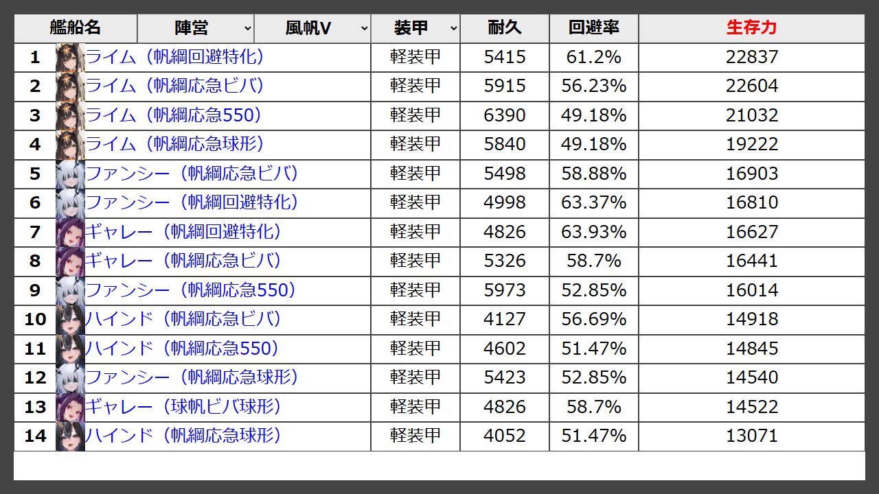 風帆Vのステータスは現状で重巡寄りと軽巡寄りの2種類が存在する。ライムは重巡寄りっぽい。