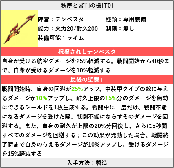 | 戦闘開始時、自身の回避が25%アップし、30秒間持続し耐久上限の15%分のダメージを無効にできるシールドを1枚生成する。戦闘開始時、味方艦隊に自身以外のテンペスタ艦船がいる場合、戦闘中に一度だけ、戦闘不能になるダメージを受けた際、戦闘不能にならずそのダメージを回避する。また、自身の耐久が上限の10%分回復し、さらに3秒間すべてのダメージを回避する;この効果が発動した場合、戦闘終了時まで自身の与えるダメージが10%アップし、受けるダメージを15%軽減する |