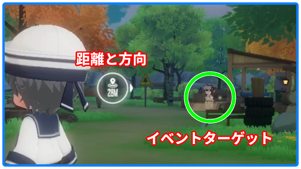 中央に表示されているマーカーは現在進行中のイベントターゲットとの距離を表しています。数値で距離、矢印で方向がわかるようになっているので、これを目印に移動すればOK。