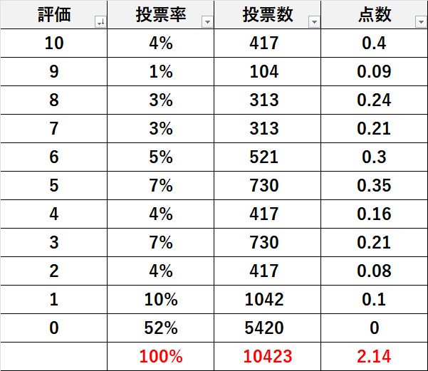 大陸で実施されたアンケートによると、10000人以上の投票で評価0が52%となっています。現時点の評価は2.14点とあまりにも酷い。