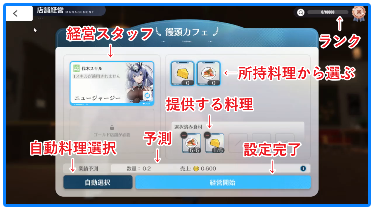 経営管理によって経験値が増え、店舗のランクが上がっていきます。ランクが上がるとメニュー枠、メニュー数量、販売確率、スタッフ数が増える。