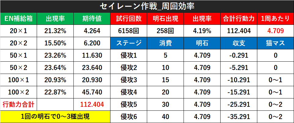 こちらの検証結果では、1周あたりの明石出現率は4.19%、1回の出現で得られる行動力は約112、1周あたりの獲得行動力は約4.7。
