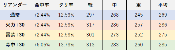 こちらは軽巡リアンダーのDPS。火力、雷装、命中を30上げたときの攻撃性能をまとめました。