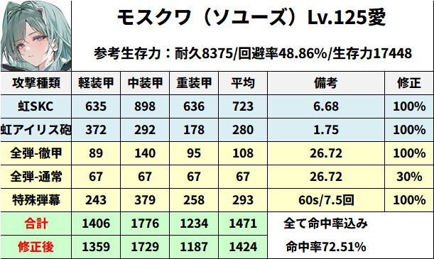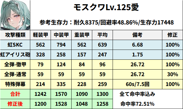 モスクワのDPS。とりあえず虹SKCと虹アイリス砲で計算。特殊弾幕は開幕3発外すものとして60秒で7.5回としています。