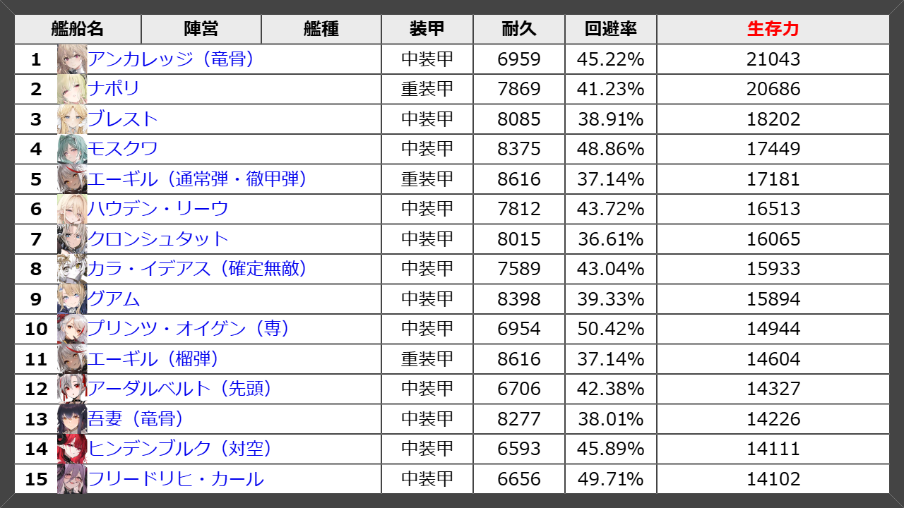 生存力は17000以上が見込めます。このくらいなら高難度海域でも通用するだろう。