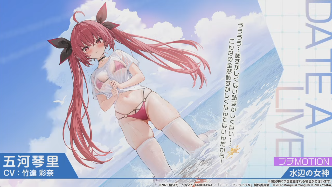 五河琴里。めちゃくちゃかわいい。妹キャラに布面積が少ない水着はヤバいって。前から見えるおしり、ふとももに食い込むニーソ、全てがドスケベ。