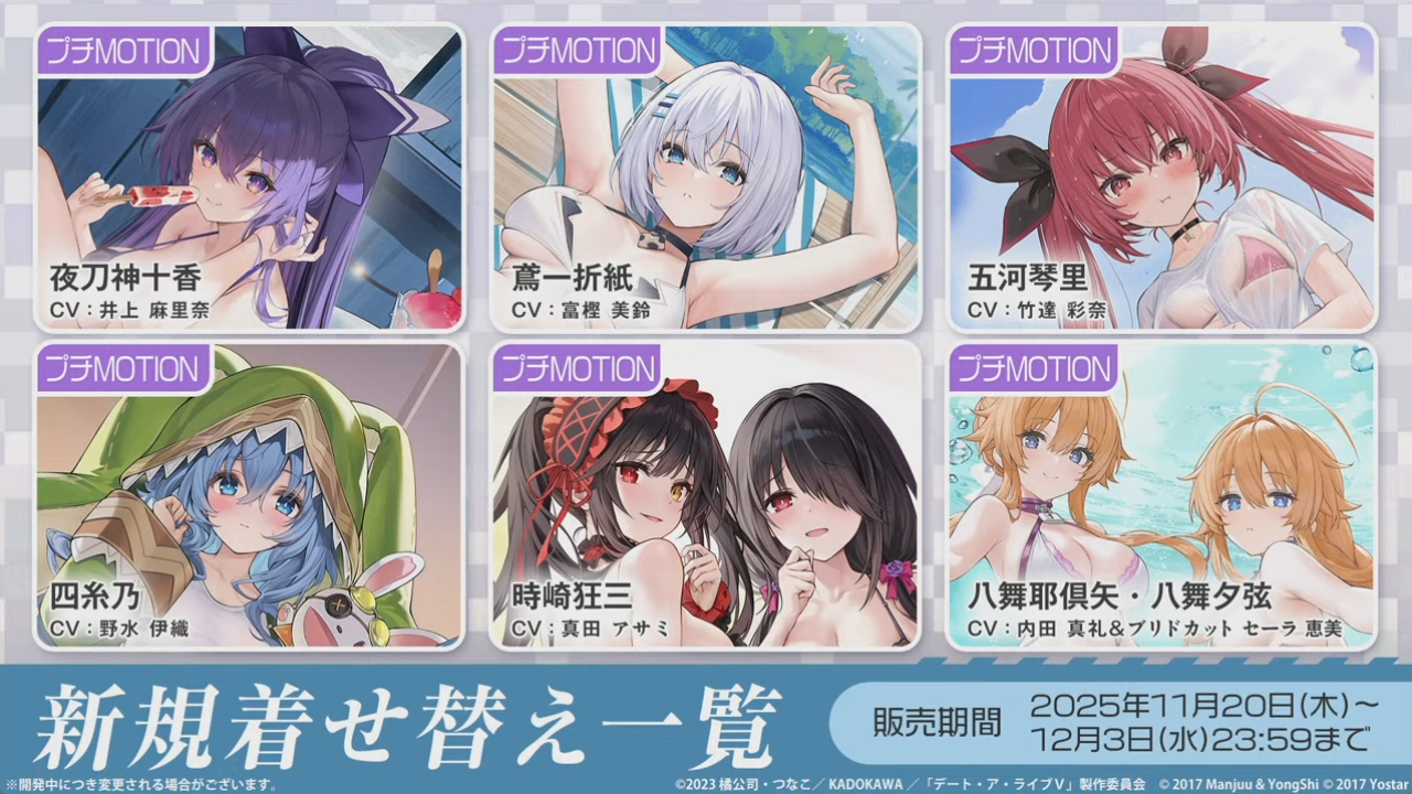 試着貸出対象は夜刀神十香、時崎狂三、五河琴里。キャラを所持していれば、一定期間だけ無料で着せ替えをお楽しみいただけます。