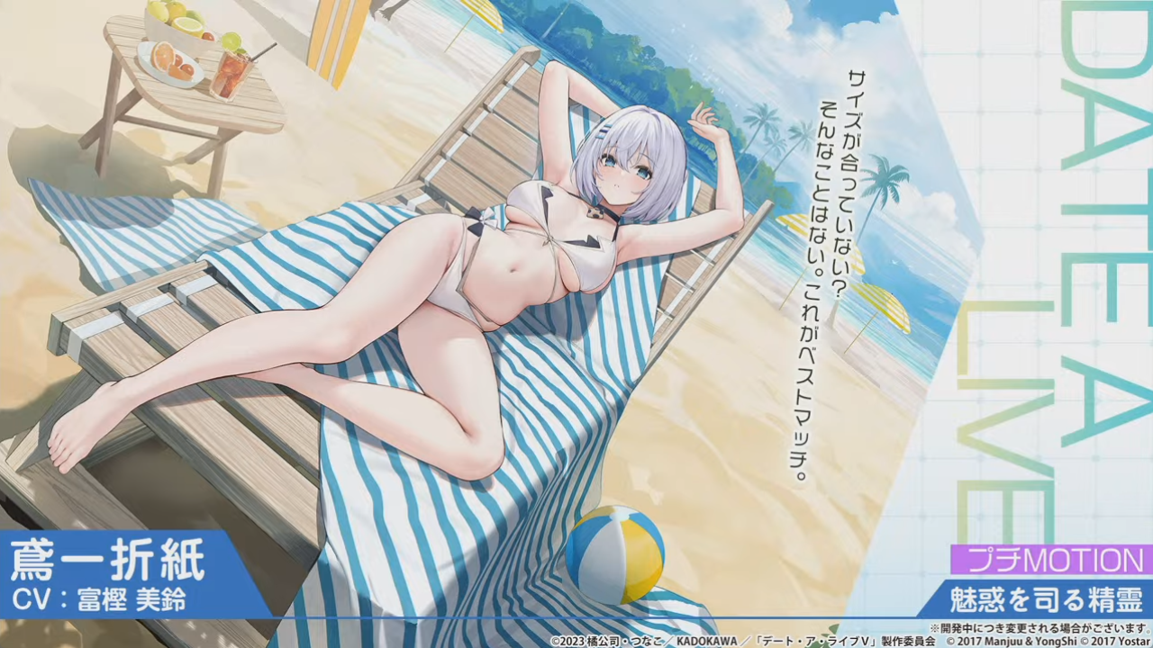 鳶一折紙。肌が白いし、水着も白いから、遠目で見たら全裸ですね。大胆なポーズがスケベ過ぎる。いますぐルパンダイブしたい。