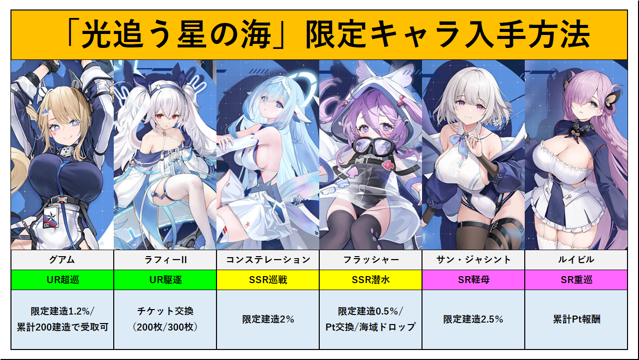 アズールレーン期間限定イベント『光追う星の海』がライト復刻されます。復刻艦船の入手方法や限定装備の強さを簡単にまとめています。イベント前におさらいしたい人や現在の評価を知りたい人にオススメです。
