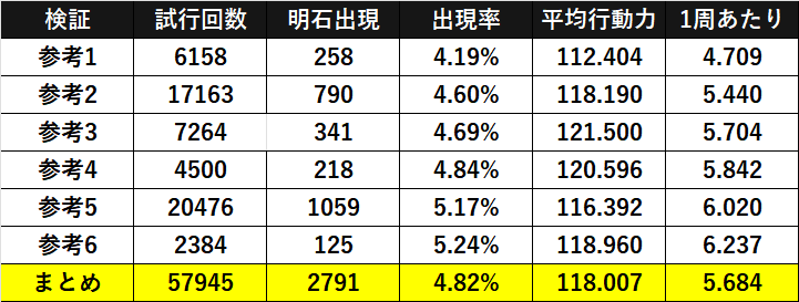 6種類のデータを合算すると明石期待値は5.684。期待値通りなら1000周で行動力+684が見込めます。