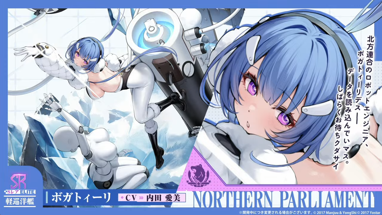北方連合の防護巡洋艦で、急にバグ?ったりクラッシュ?したり再起動?したりする謎の少女。ロボを自作して家事をやらせるほどのロボ専門家で、本人も実にロボなのでは?と言われている。はい。イベント報酬にて入手デキマス。