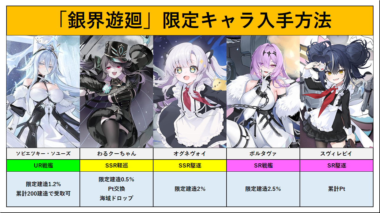 SSR戦艦「ガングート(META)」の排出率は0.5%となるでしょう。こちらはイベントPtを集めて交換するか、一部イベント海域でドロップも狙えるはず。