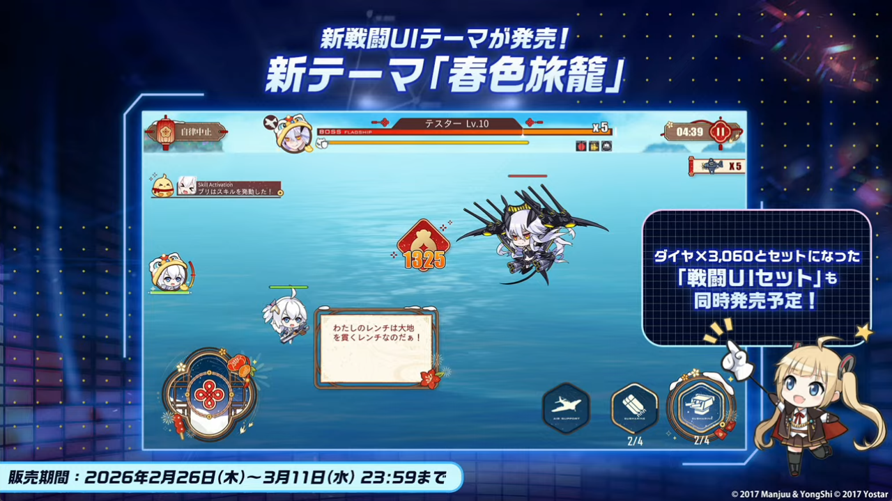 デモ動画ではNPCを2体召喚しており、特殊弾幕で砲撃と魚雷を発射。SRということでちょっと厳しいと思いますが、NPCの性能次第ではワンチャンあるかも。
